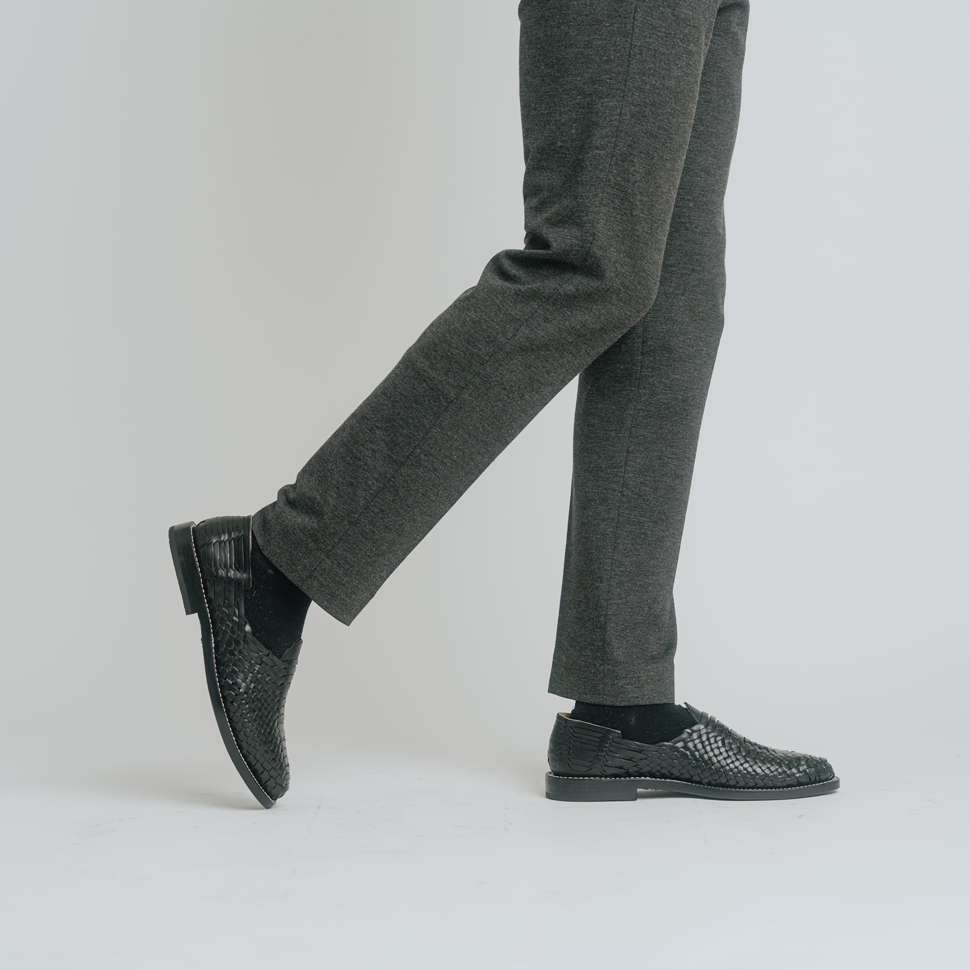 Handwoven from full-grain leather using a dense lattice technique, this silhouette introduces a more sculptural interpretation of the traditional huarache. The weave tightens toward the vamp, creating a natural ridge that echoes the movement of a serpent's scales.